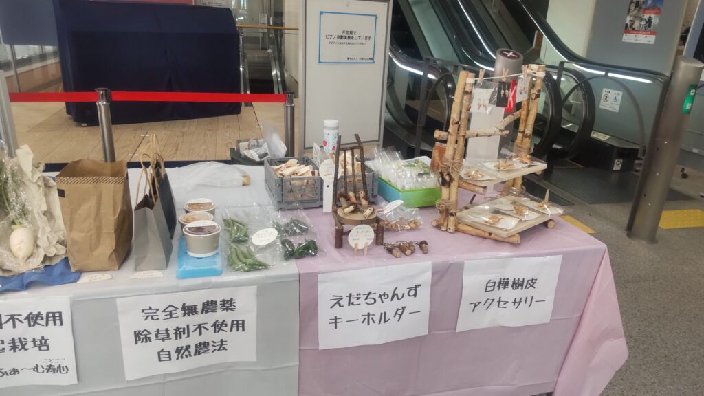 白樺細工・えだちゃんずキーホルダーとお野菜たちを好きなように並べて、この時とばかりに白樺アクセサリーを付け、活動アピールをしてきました🥰