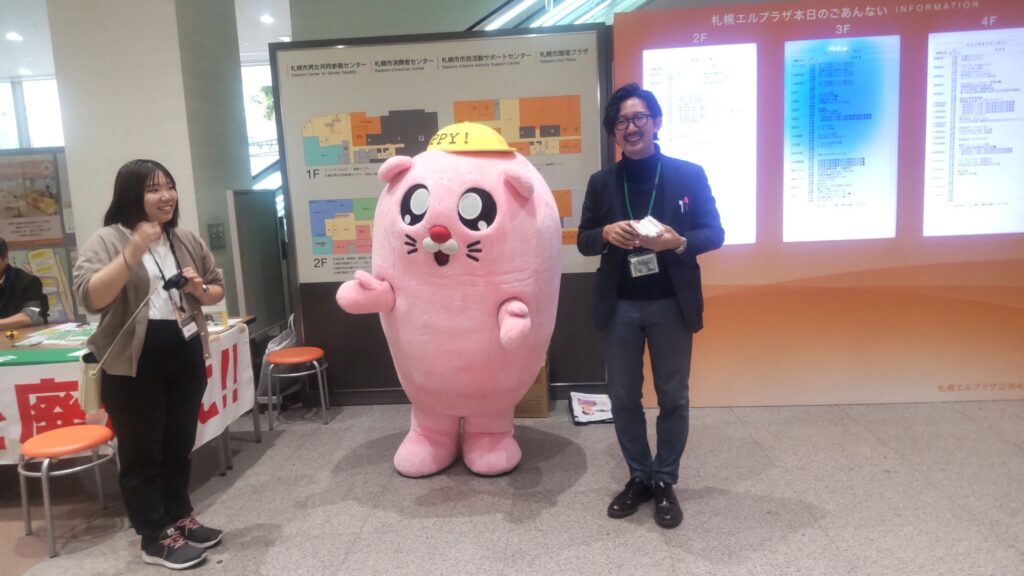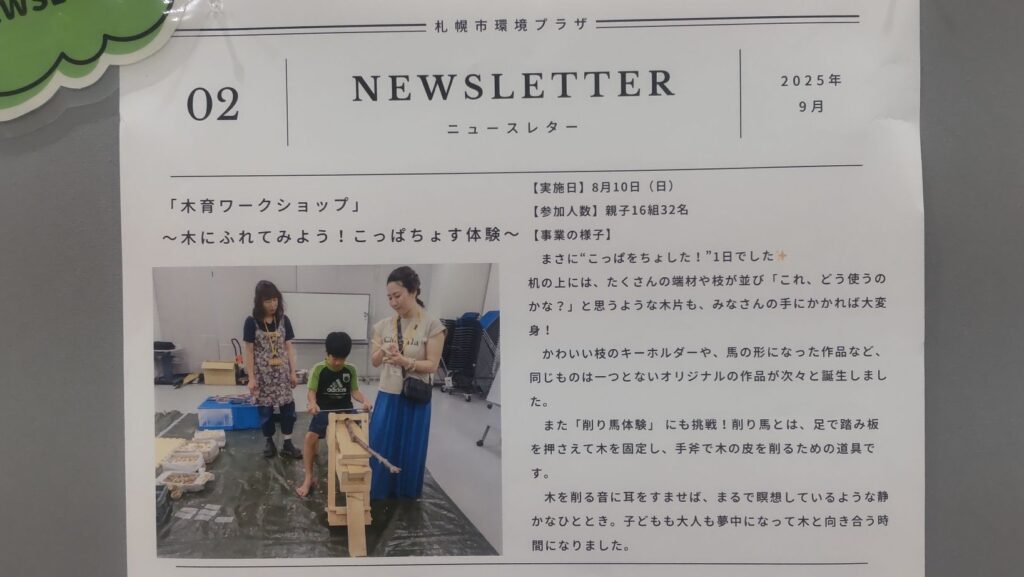 2日目はちょっと奥まったところに配置され、あんまりお客さん来ないだろうな~と斜め向かいのブースの方とお話をしていたら…ある写真が目に入り、なんか見たことある光景だなぁ、と…よ~くよく見ると、私だ!私が映ってました🤣8月に環境プラザで木育WSした時の記事でニュースレターのポスターに映っていたのでした✌アラビックリ