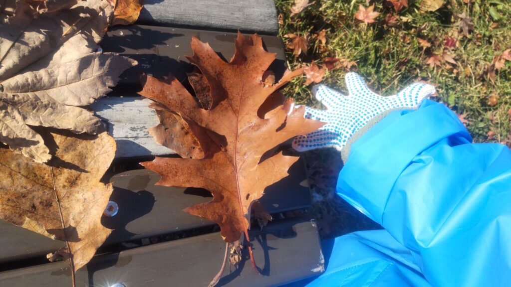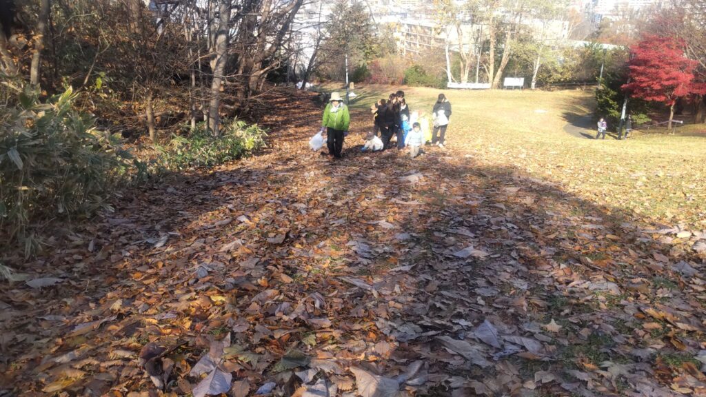藻南公園でと思っていたのですが落ち葉を掃除しちゃっていたのと、昨日、天神山へ下見に行ったらまだたくさん落ち葉があったので、最後の葉っぱ遊びをしたくて、天神山緑地に変更しました。