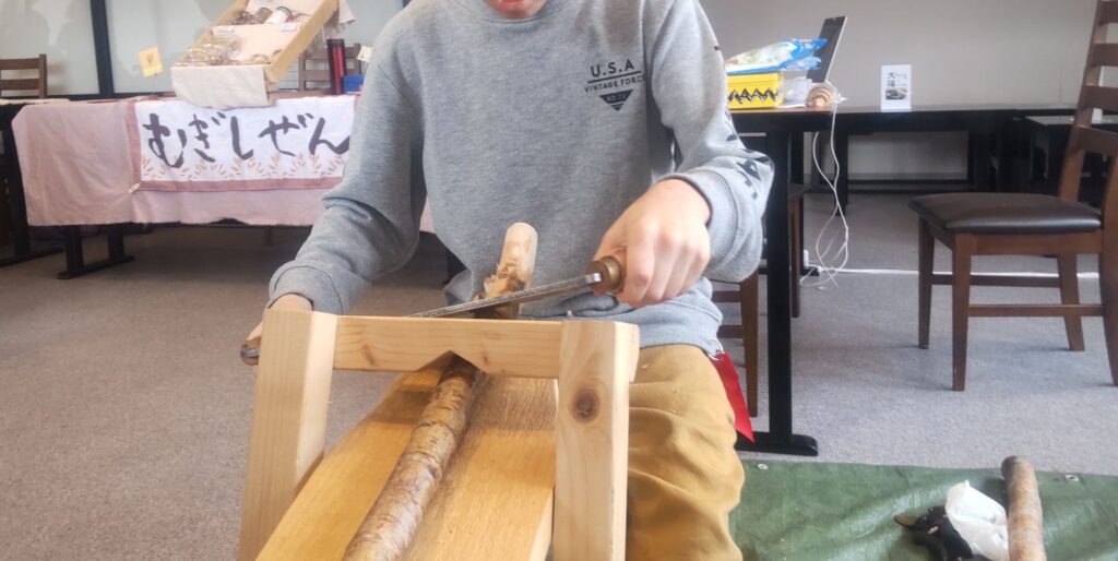 銑(せん)(ドローナイフ)を両手で持ち、枝を固定し樹皮を削っていく道具です。