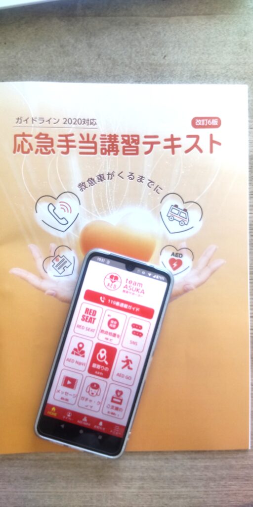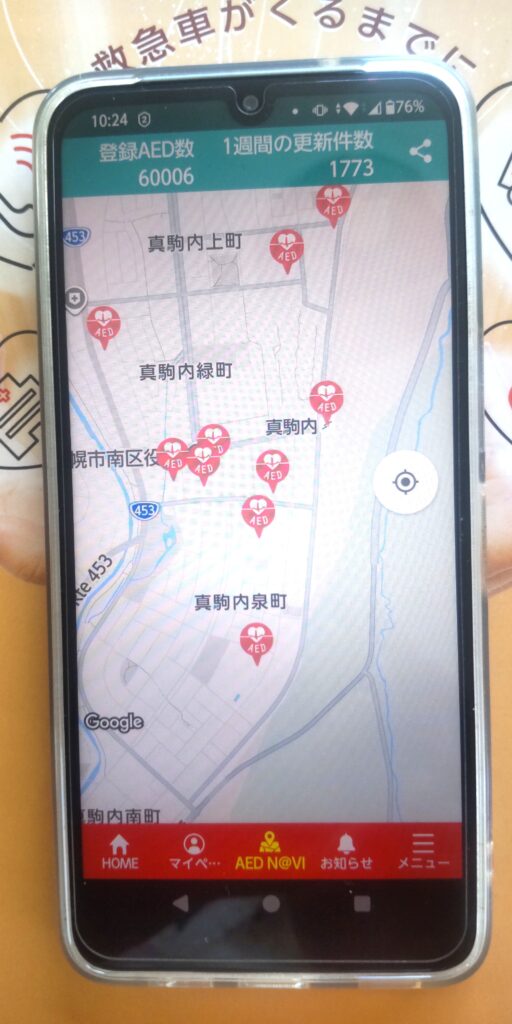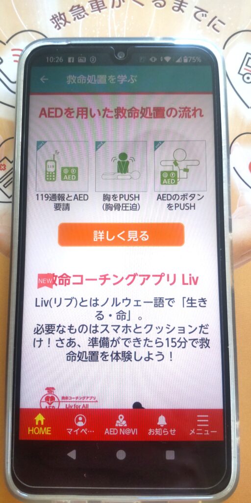 このアプリではAEDの位置やそこまでのナビ、119番通報、救命処置を学べたりします。